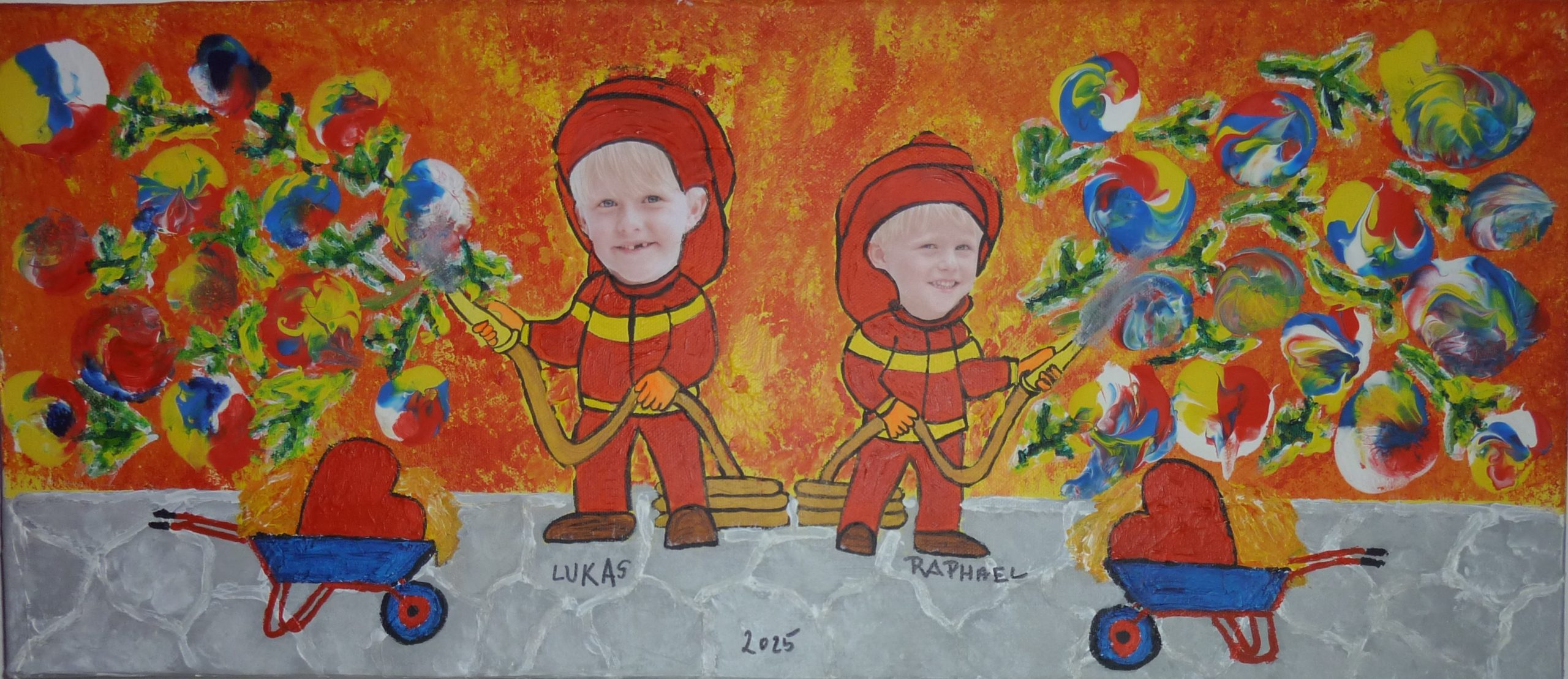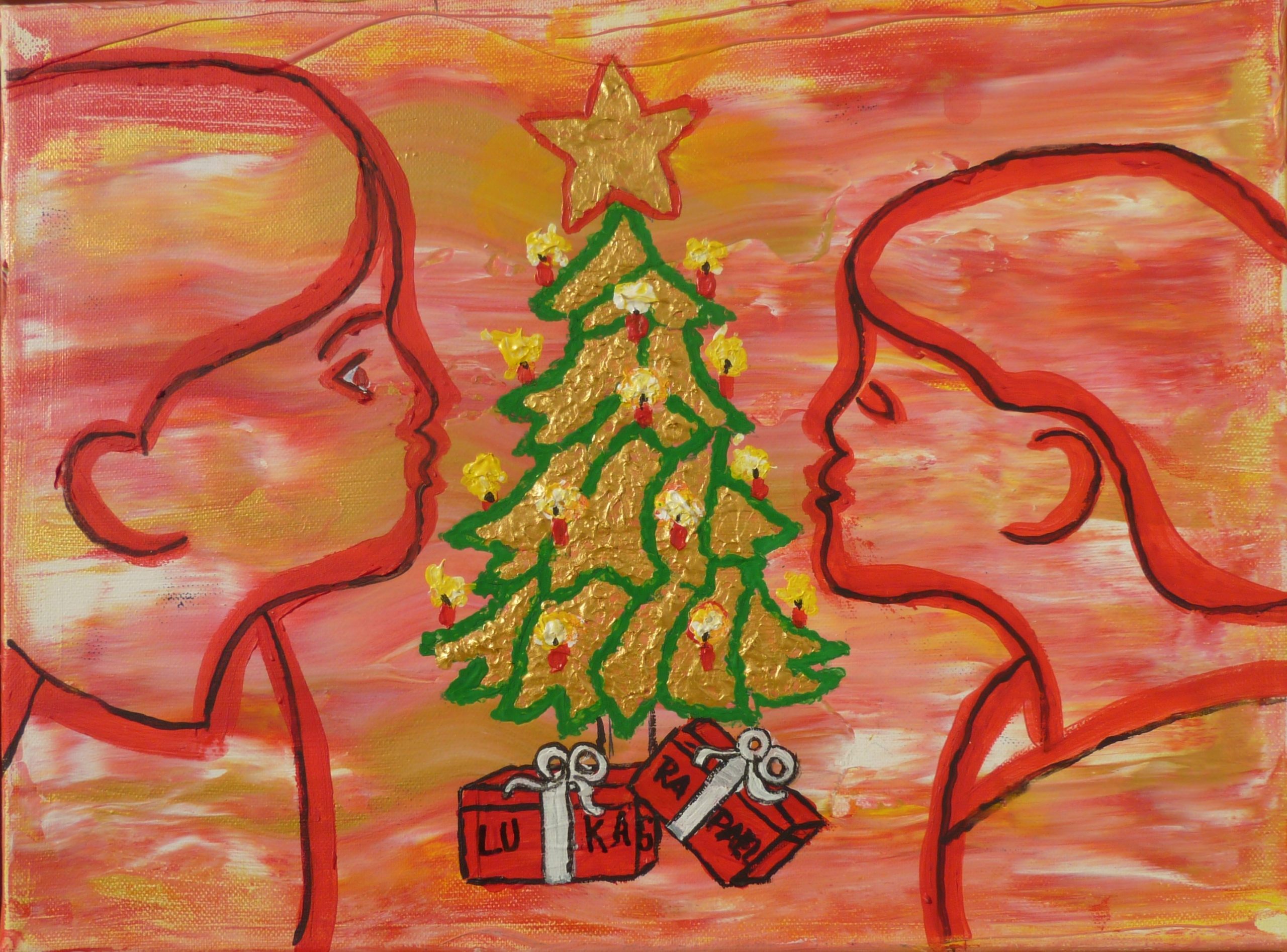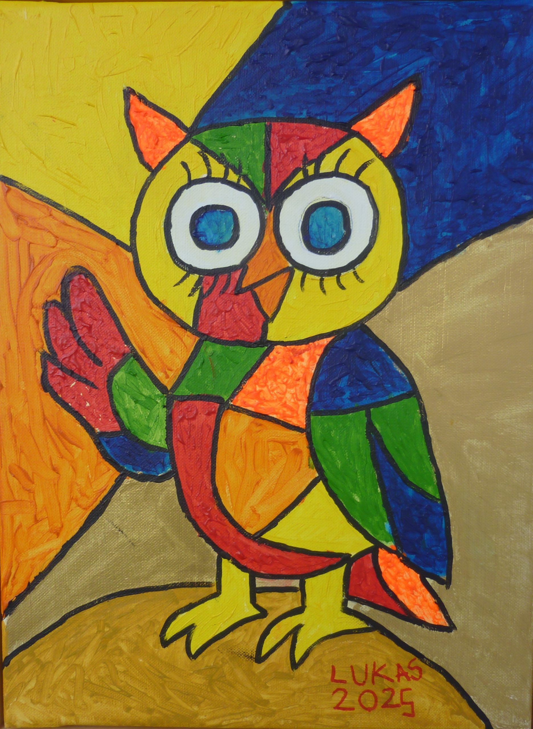 Talenteschmiede ein Versuch (mit meinen Enkel - 2025 6 und 4 Jahre alt) kreativ zu sein Hintergrund mit einem Fensterreiniger - Farben "ziehen" - Baum "getupft" Weihnachten 2025 Acryl mit Luftballon "gemalt" Vorlage KI "Eule im Stil von Picasso" (Flächen) - Erstlingswerk (Acryl)